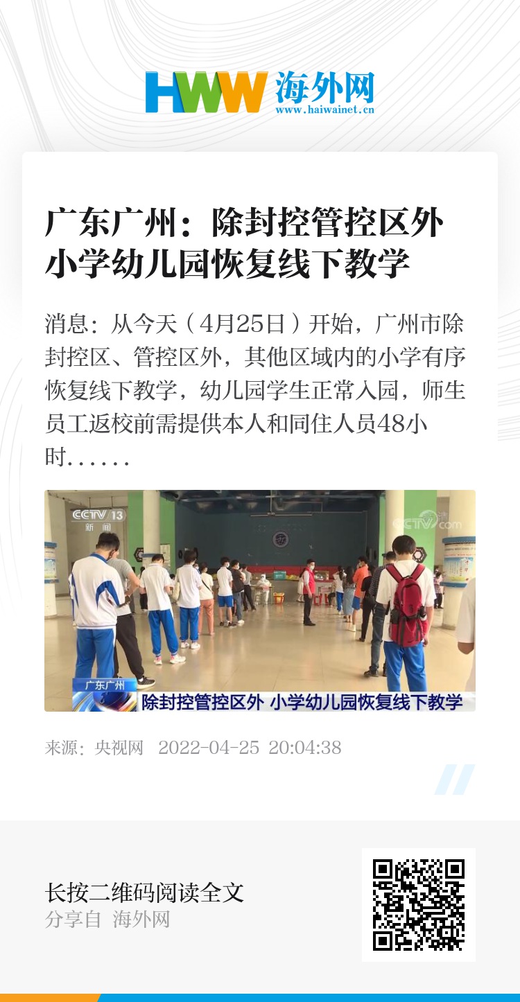 央视网消息:从今天(4月25日)开始,广州市除封控区、管控区外,其他区域内的小学有序恢复线下教学,幼儿园学生正常入园,师生员工返校前需提供本人和同住人员48小时核酸检测阴性证明。
