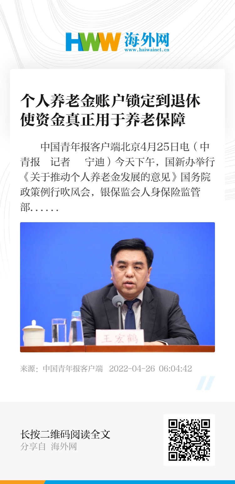 中国青年报客户端北京4月25日电(中青报・中青网记者 宁迪)今天下午,国新办举行《关于推动个人养老金发展的意见》国务院政策例行吹风会,银保监会人身保险监管部负责人王宏鹤强调,个人养老金账户锁定到退休,目的是使个人投入的资金真正用于养老保障。