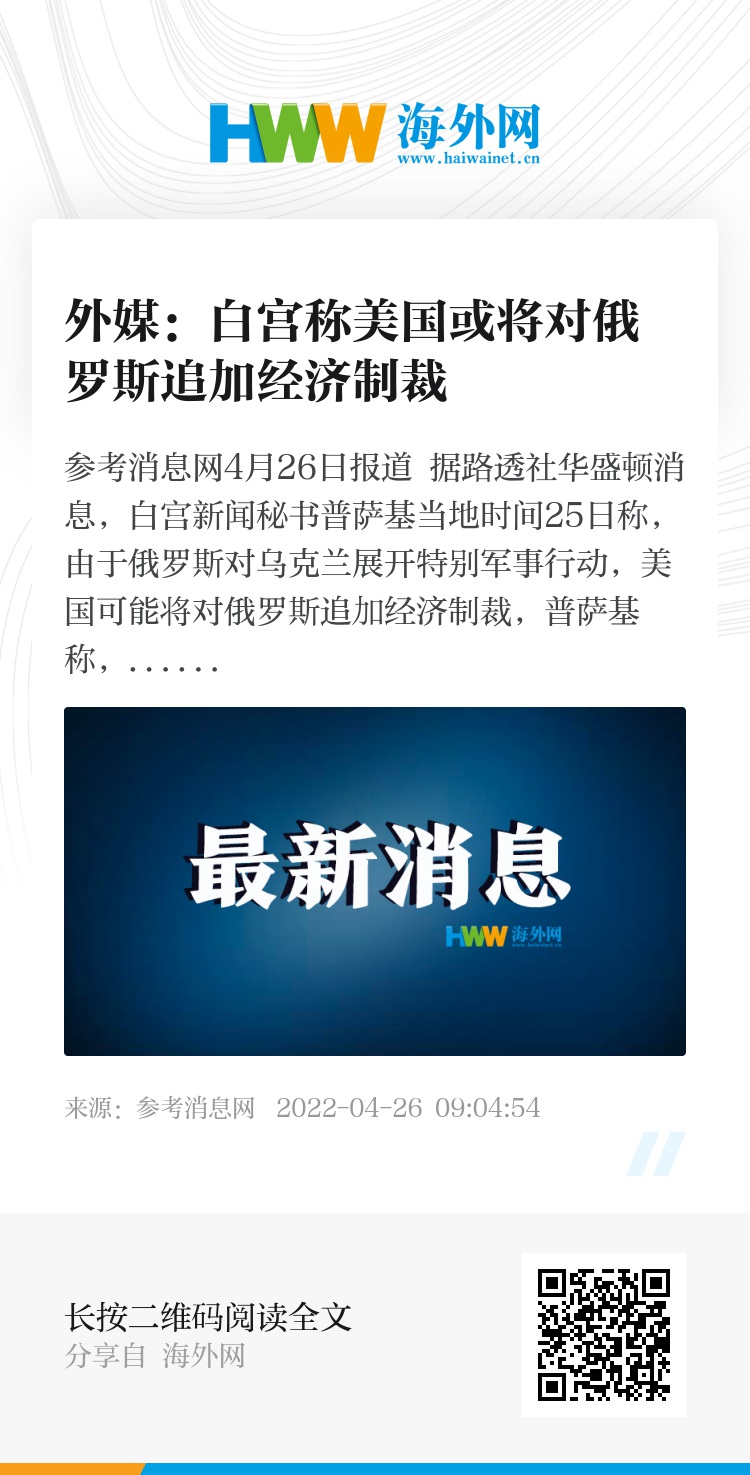 参考消息网4月26日报道 据路透社华盛顿消息,白宫新闻秘书普萨基当地时间25日称,由于俄罗斯对乌克兰展开特别军事行动,美国可能将对俄罗斯追加经济制裁,普萨基称,“没有任何人会免受我们的制裁”。(编译/金进龙)
