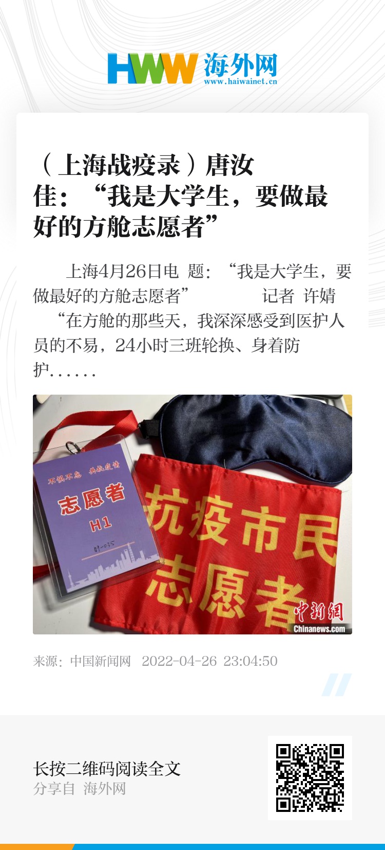 中新网上海4月26日电 题:“我是大学生,要做最好的方舱志愿者”
