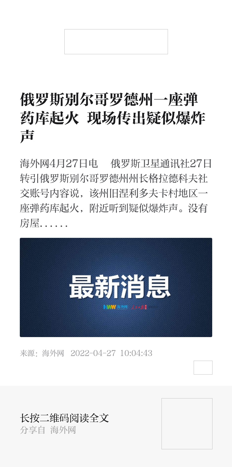 海外网4月27日电 俄罗斯卫星通讯社27日转引俄罗斯别尔哥罗德州州长格拉德科夫社交账号内容说,该州旧涅利多夫卡村地区一座弹药库起火,附近听到疑似爆炸声。没有房屋受损,无人员伤亡。(海外网 张琪)