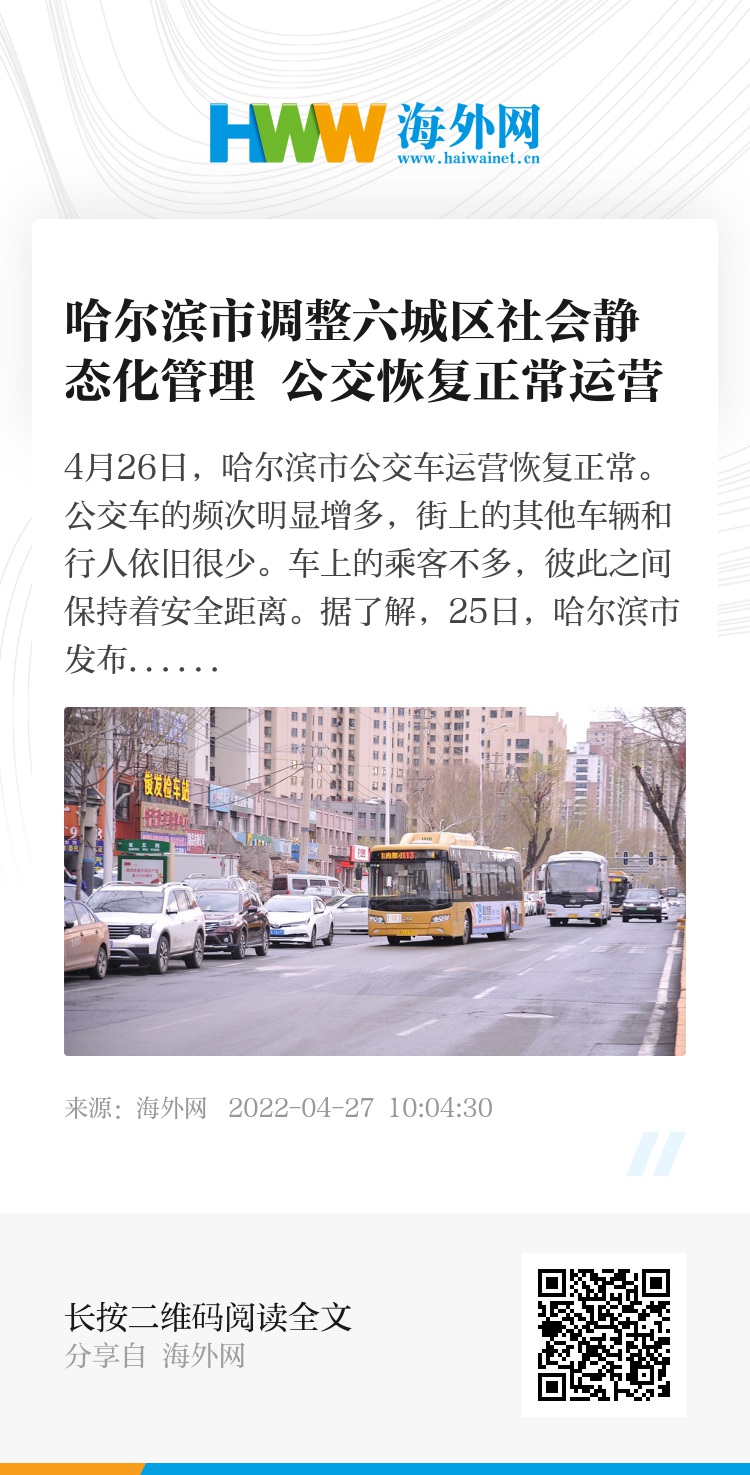 32402844,.哈尔滨市调整六城区社会静态化管理 公交恢复正常运营,.2022-04-27 10:52:30,.204428,.张青津、庄鹏泽