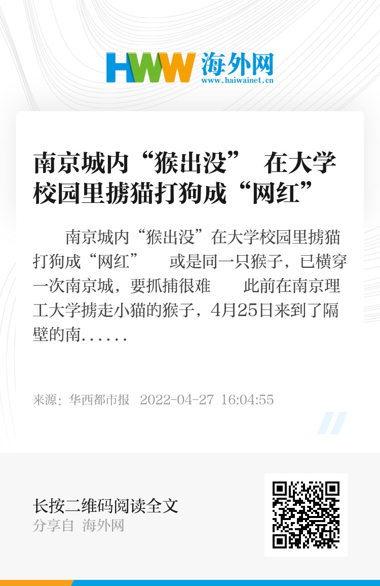 此前在南京理工大学掳走小猫的猴子,4月25日来到了隔壁的南京农业大学。