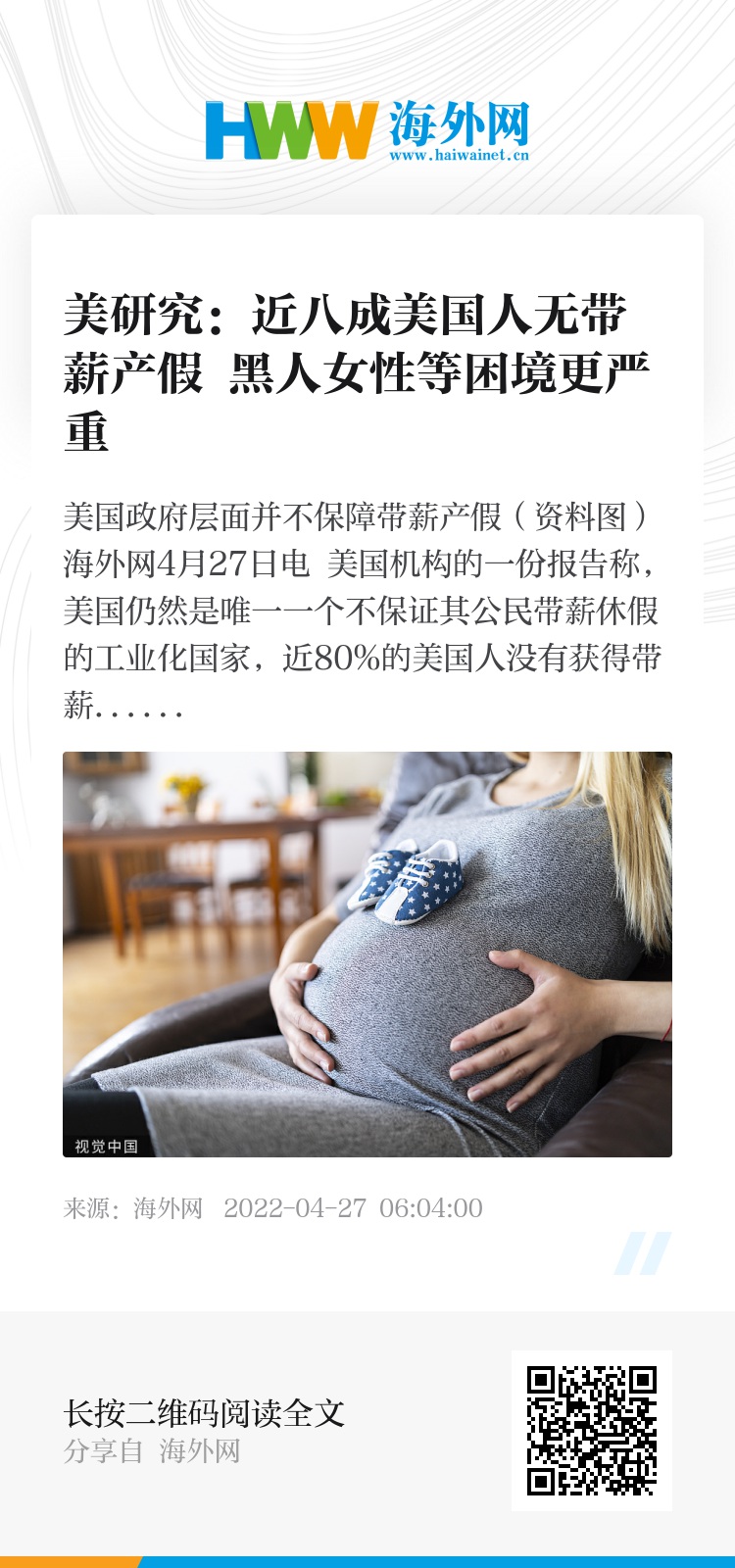 海外网4月27日电 美国机构的一份报告称,美国仍然是唯一一个不保证其公民带薪休假的工业化国家,近80%的美国人没有获得带薪产假的制度保障。