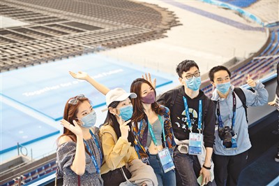 受邀体验“双奥”主题旅游线路的北京冬奥会开闭幕式志愿者在国家体育场“鸟巢”留影。新华社记者 陈钟昊摄