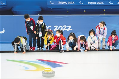 小朋友在国家游泳中心“冰立方”等候进行冰壶体验。 新华社记者 鞠焕宗摄