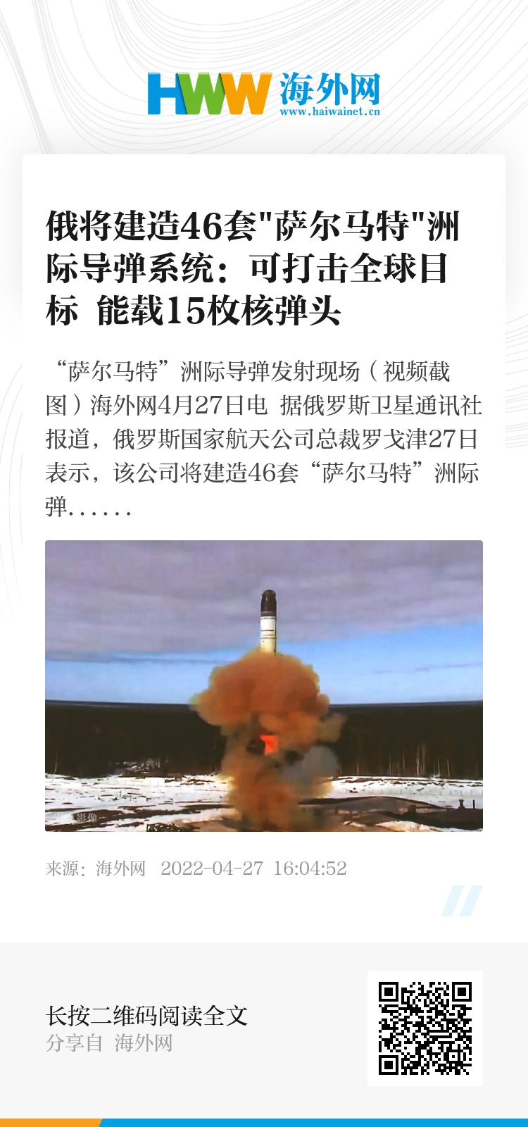 海外网4月27日电 据俄罗斯卫星通讯社报道,俄罗斯国家航天公司总裁罗戈津27日表示,该公司将建造46套“萨尔马特”洲际弹道导弹系统。