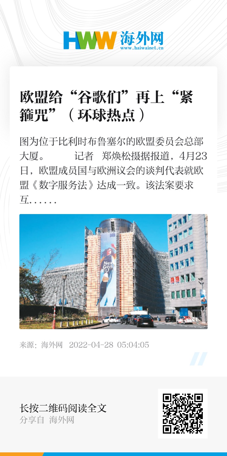 据悉,《数字服务法》是欧盟为保护互联网用户采取双重措施的第二部分,第一项措施是《数字市场法》。3月24日,欧洲议会、欧洲理事会和欧盟委员会就《数字市场法》达成协议。法新社称,该法案将首次规定大型线上平台在欧盟市场的竞争规则。