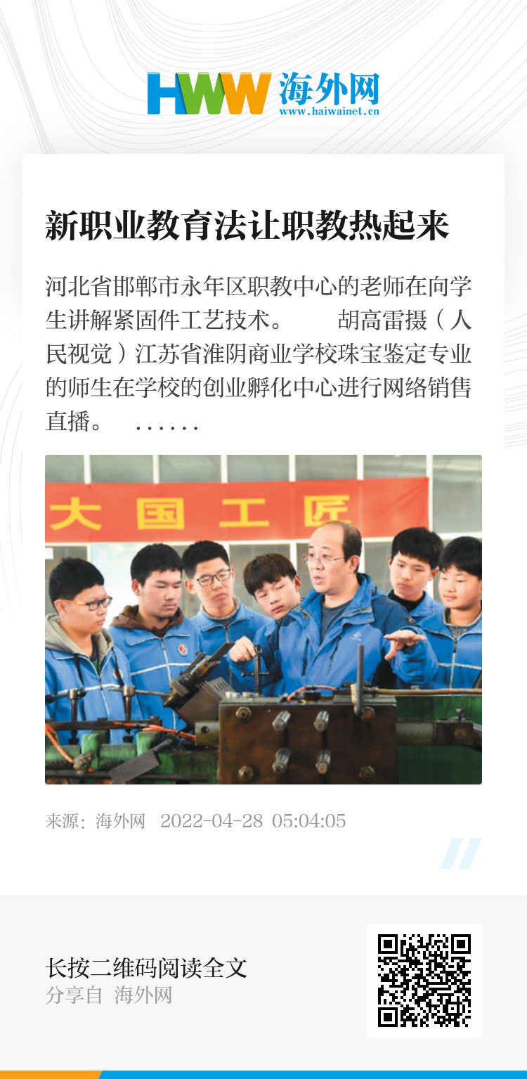 目前,中国已建成世界规模最大的职业教育体系,共有职业学校1.13万所,在校生超过3000万人,但高技能人才的比例距发达国家仍有差距。随着法律的完善,职业教育正在“香起来”“热起来”,以培养更多高素质技术技能人才、能工巧匠、大国工匠。