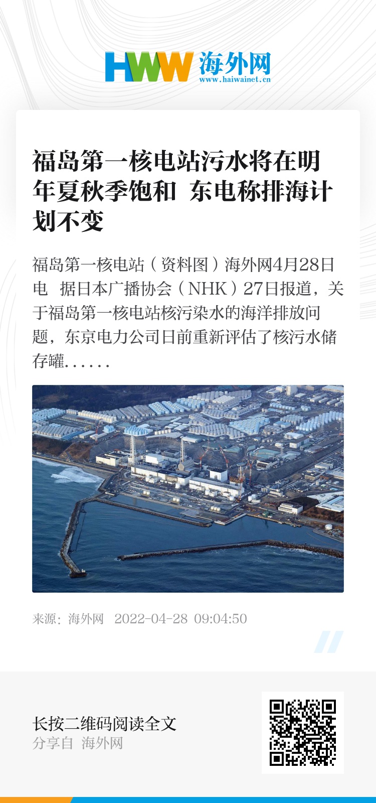海外网4月28日电 据日本广播协会(NHK)27日报道,关于福岛第一核电站核污染水的海洋排放问题,东京电力公司日前重新评估了核污水储存罐的饱和时间,为下一步排海做准备。