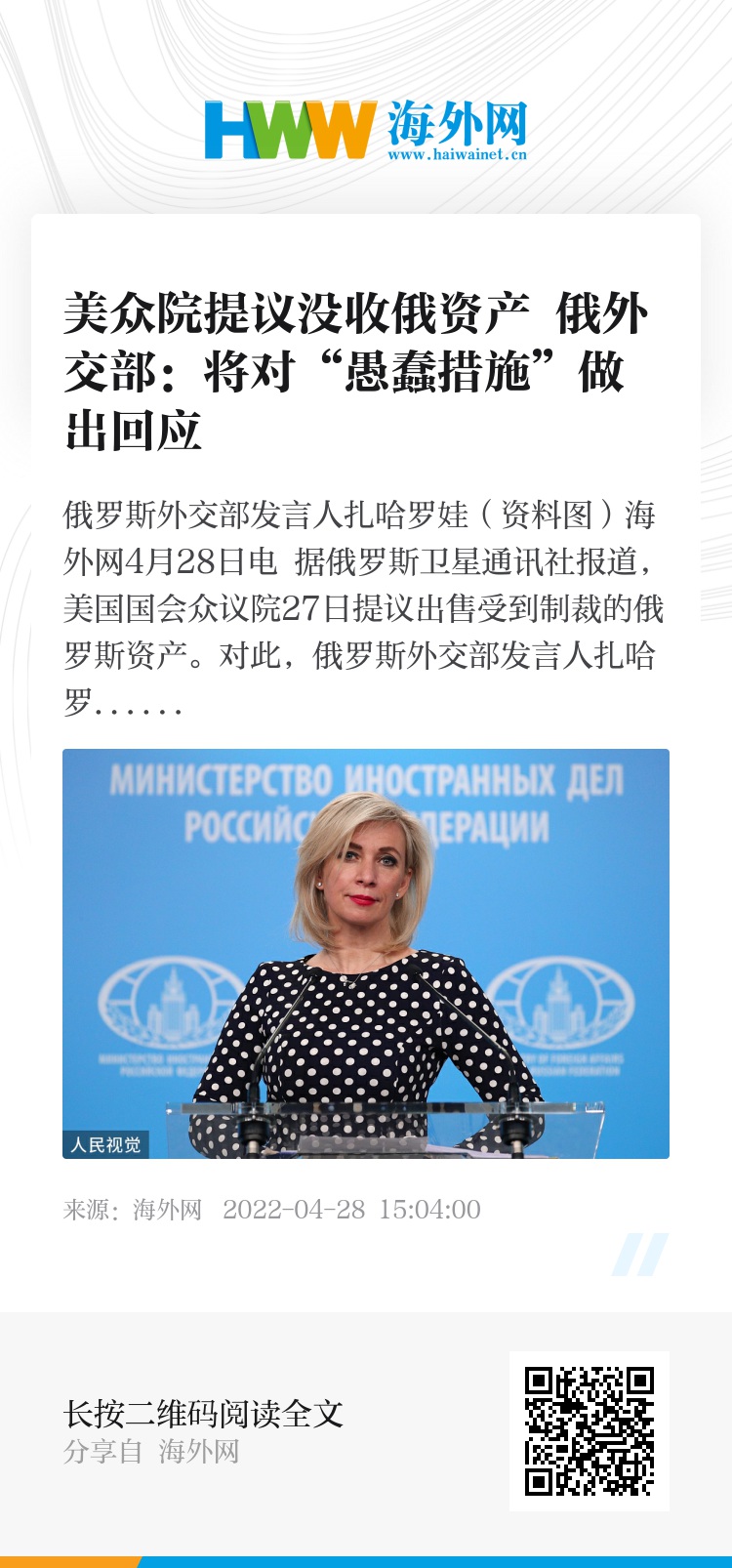 海外网4月28日电 据俄罗斯卫星通讯社报道,美国国会众议院27日提议出售受到制裁的俄罗斯资产。对此,俄罗斯外交部发言人扎哈罗娃28日回应指出,俄罗斯将对“愚蠢措施”做出回应。
