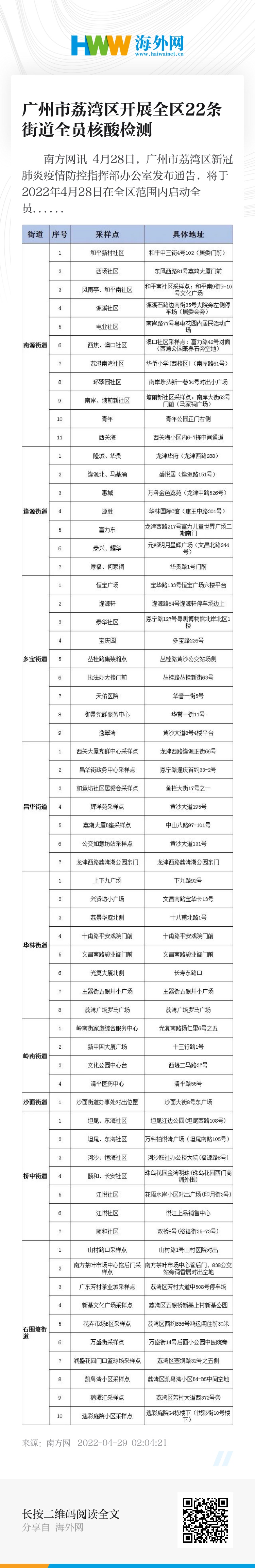 广州市荔湾区22条街道街道核酸检测临时检测点(2022年4月28日)