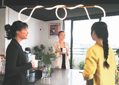 三名创业者在海南华二代孵化器的公共咖啡区交谈。詹胜洁供图