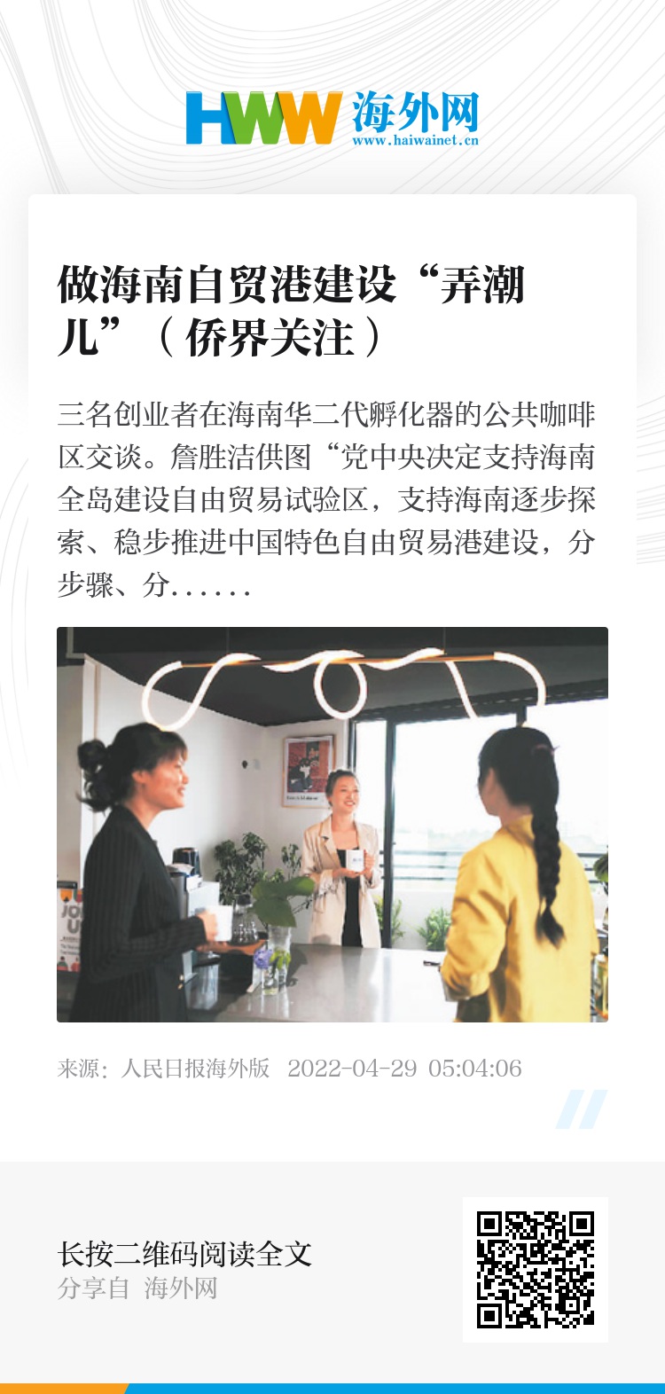 几年来,全球各地的许多华侨华人不远万里回到祖(籍)国,来到海南投资兴业,融入海南自贸港建设的大潮之中。其中,年轻一代华侨华人带着各自的新点子、新技能、新团队,投身新行业、新领域的创新创业事业,为海南自贸港建设增添了新活力。