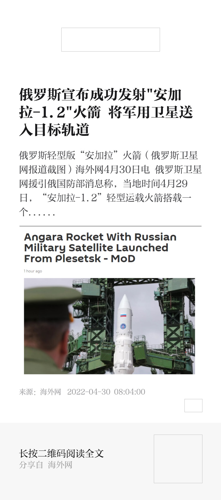 俄国防部表示,火箭发射时间为莫斯科时间4月29日22时56分,发射地点为阿尔汉格尔斯克州普列谢茨克航天发射场43号发射台。所有的发射前操作和火箭启动均正常完成。