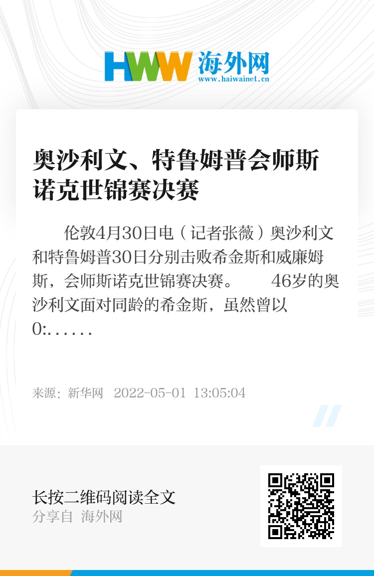 新华社伦敦4月30日电(记者张薇)奥沙利文和特鲁姆普30日分别击败希金斯和威廉姆斯,会师斯诺克世锦赛决赛。