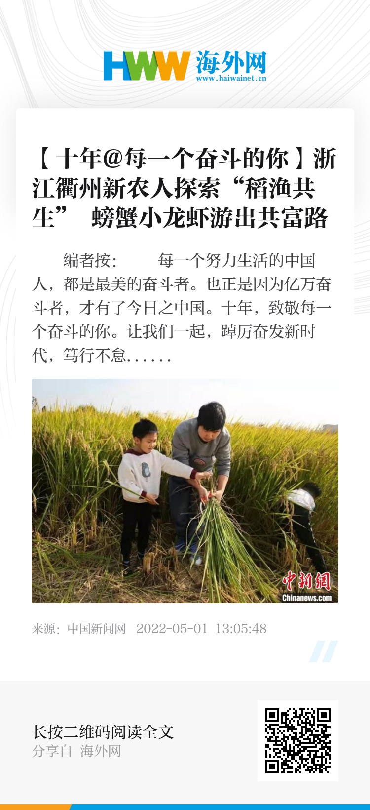 中新网衢州5月1日电(张斌 傅飞扬 陈明明)每天清晨,浙江省衢州市柯城区石梁镇静岩村的稻田虾蟹综合种养区里,种养技术员都会拿着装有小龙虾的养殖笼,穿梭在田间。