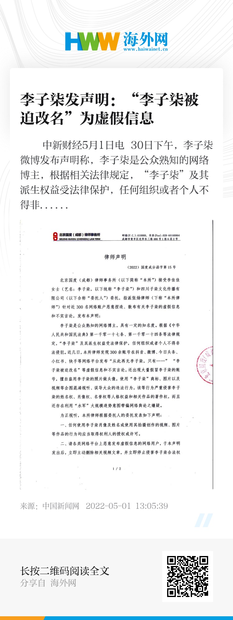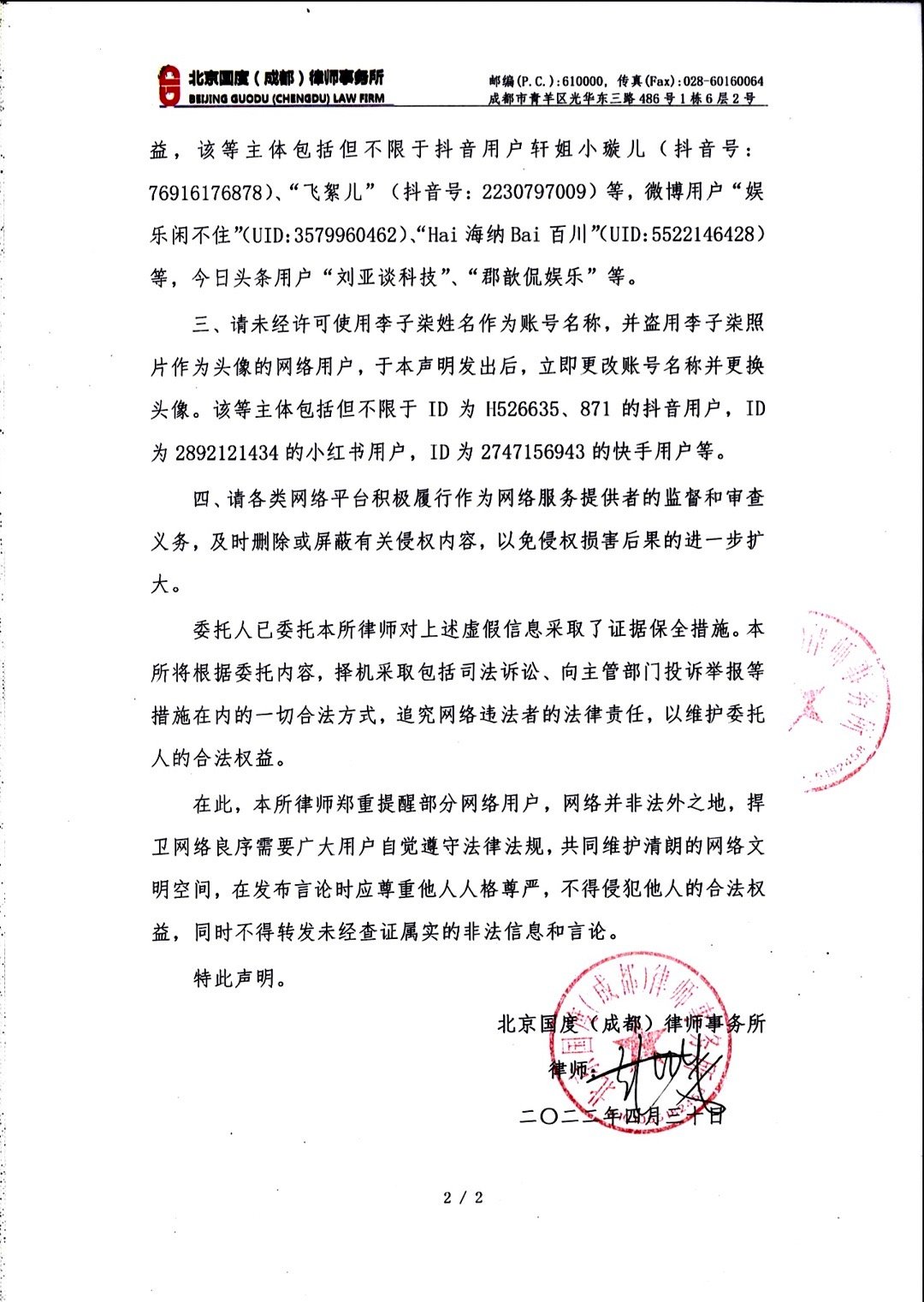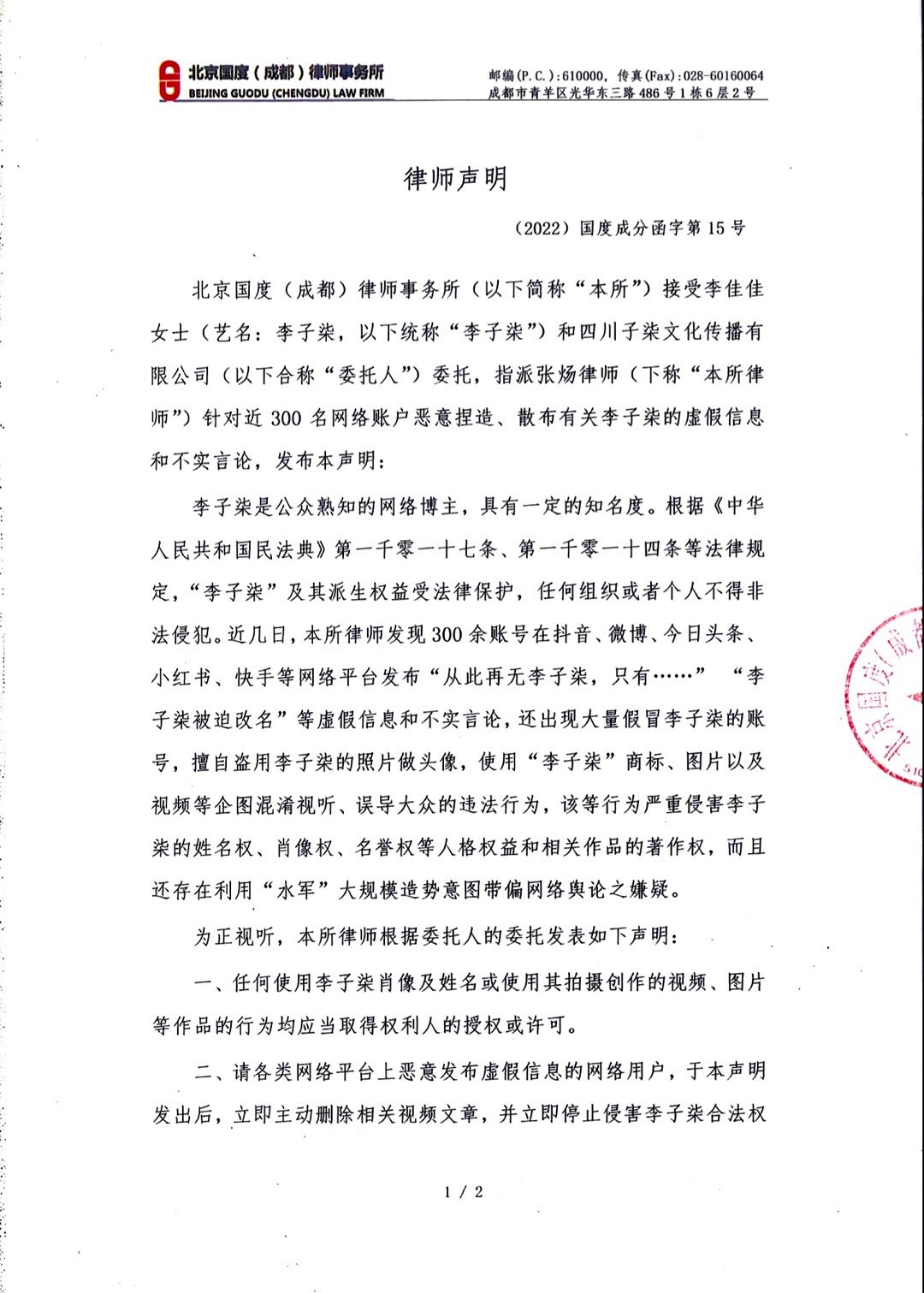 该声明显示,受李子柒等委托人委托,国度(成都)律师事务所发现,近几日300余账号在抖音、微博、今日头条、小红书、快手等网络平台发布“从此再无李子柒,只有……”“李子柒被迫改名”等虚假信息和不实言论,还出现大量假冒李子柒的账号,擅自盗用李子柒的照片做头像,使用“李子柒”商标、图片以及视频等企图混淆视听、误导大众的违法行为,该等行为严重侵害李子柒的姓名权、肖像权、名誉权等人格权益和相关作品的著作权,而且还存在利用“水军”大规模造势意图带偏网络舆论之嫌疑。