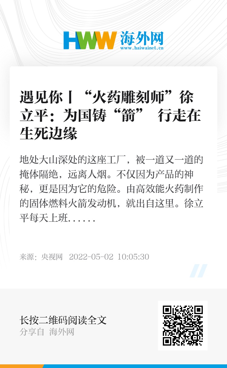 好友的牺牲,让徐立平更加明确地认识到规范操作细则的必要。从那以后的每一个产品,徐立平都会亲自试验,确定火药的性能和燃烧速度。