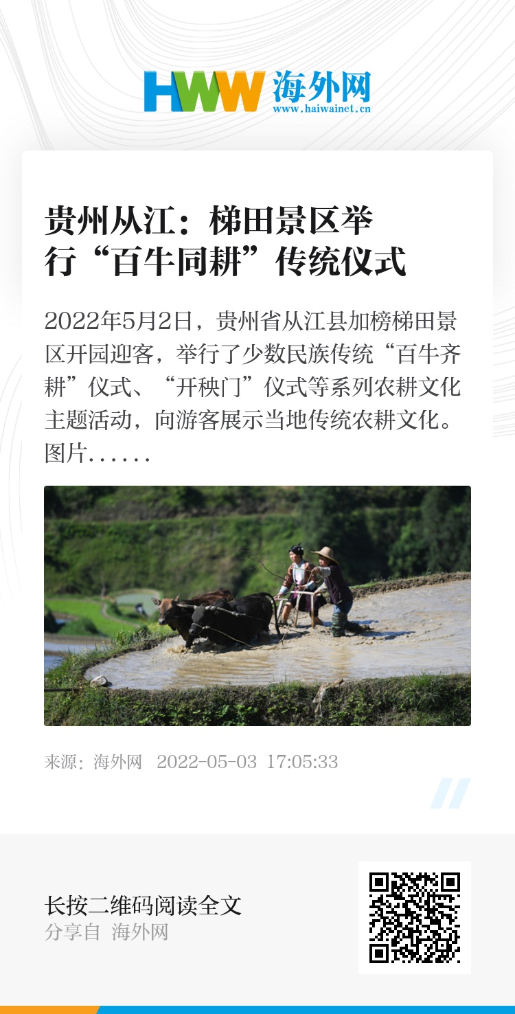 2022年5月2日,贵州省从江县加榜梯田景区开园迎客,举行了少数民族传统“百牛齐耕”仪式、“开秧门”仪式等系列农耕文化主题活动,向游客展示当地传统农耕文化。图片来源:视觉中国