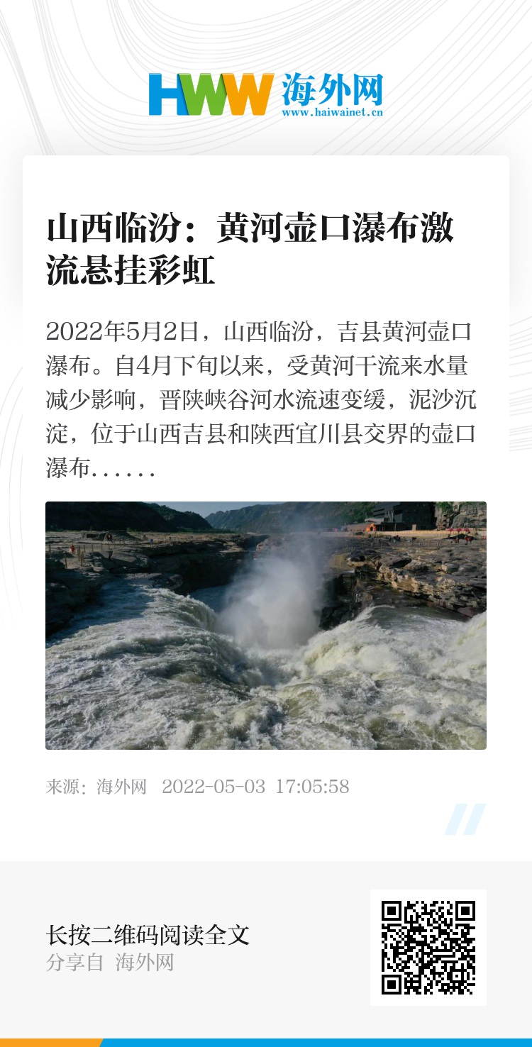 2022年5月2日,山西临汾,吉县黄河壶口瀑布。自4月下旬以来,受黄河干流来水量减少影响,晋陕峡谷河水流速变缓,泥沙沉淀,位于山西吉县和陕西宜川县交界的壶口瀑布水色明显变清,呈现出别于日常的“清流飞瀑”景观。图片来源:视觉中国
