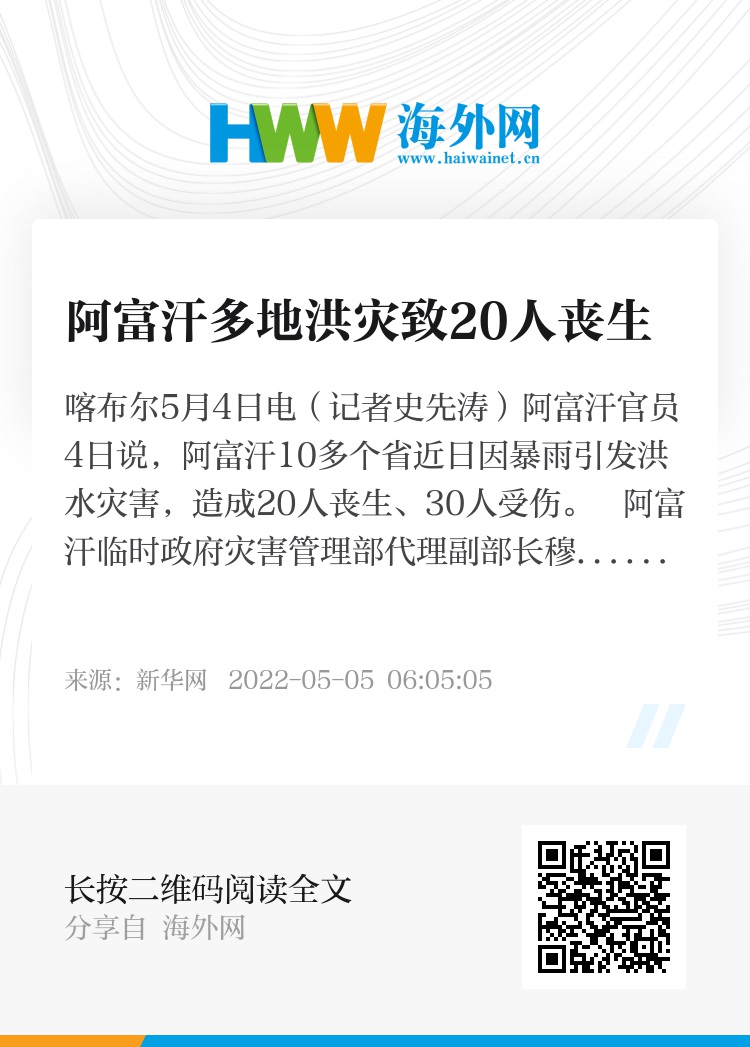 新华社喀布尔5月4日电(记者史先涛)阿富汗官员4日说,阿富汗10多个省近日因暴雨引发洪水灾害,造成20人丧生、30人受伤。
