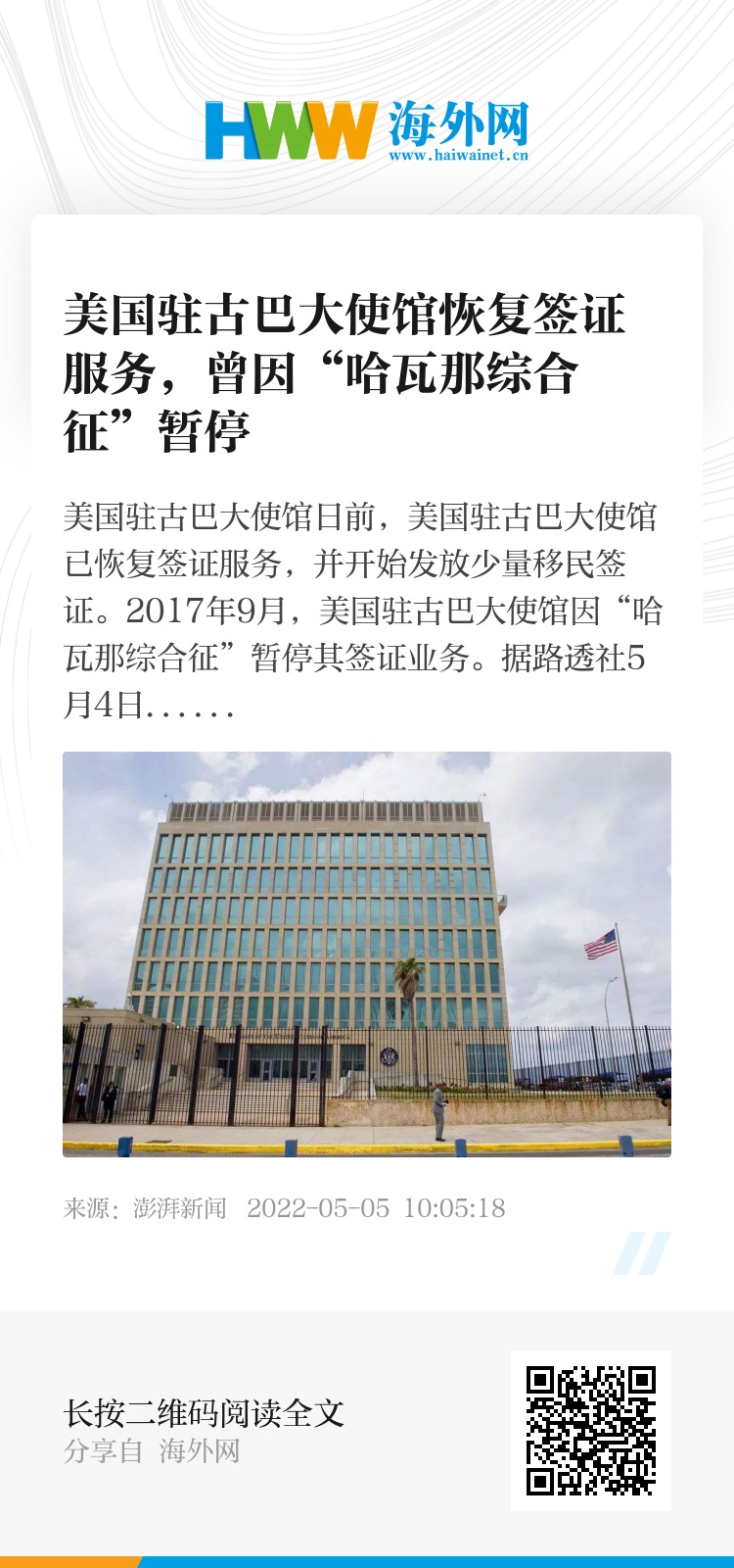 据路透社5月4日报道,美国驻古巴大使馆在其社交平台上发文称,“我们很高兴,我们目前在(古巴首都)哈瓦那重新启动的、有限的移民签证工作运行得不错。我们期待在未来处理更多移民签证、继续扩大在哈瓦那的领事服务。”