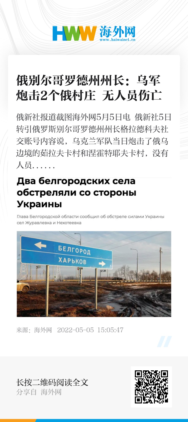 海外网5月5日电 俄新社5日转引俄罗斯别尔哥罗德州州长格拉德科夫社交账号内容说,乌克兰军队当日炮击了俄乌边境的茹拉夫卡村和涅霍特耶夫卡村,没有人员伤亡。涅霍特耶夫卡村的一所房屋和一个车库被毁。(海外网 张琪)