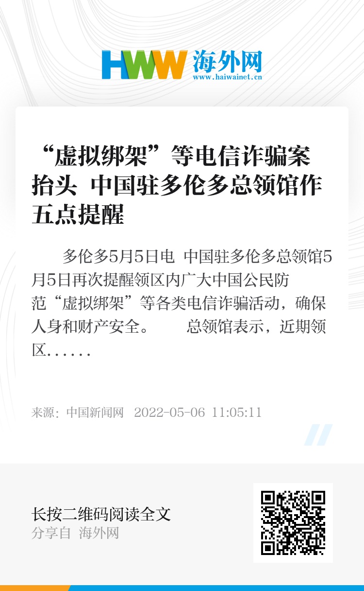 中新网多伦多5月5日电 中国驻多伦多总领馆5月5日再次提醒领区内广大中国公民防范“虚拟绑架”等各类电信诈骗活动,确保人身和财产安全。