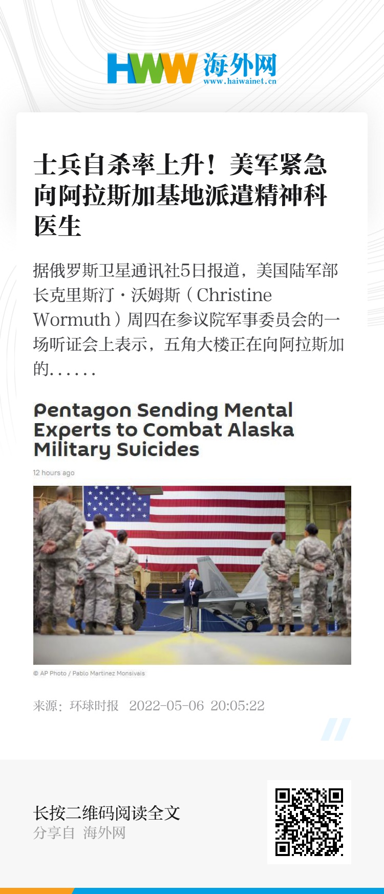 据此前报道,去年7月在听取了驻阿拉斯加美国军人自杀率激增的简报后,美国国防部长奥斯汀发表讲话称,“我对自杀率深感担忧,不仅是在这里,而且是在整个(美军)部队中。自杀造成的损失太大了。虽然我们正在努力解决这个问题,但我们还有很多工作要做。”