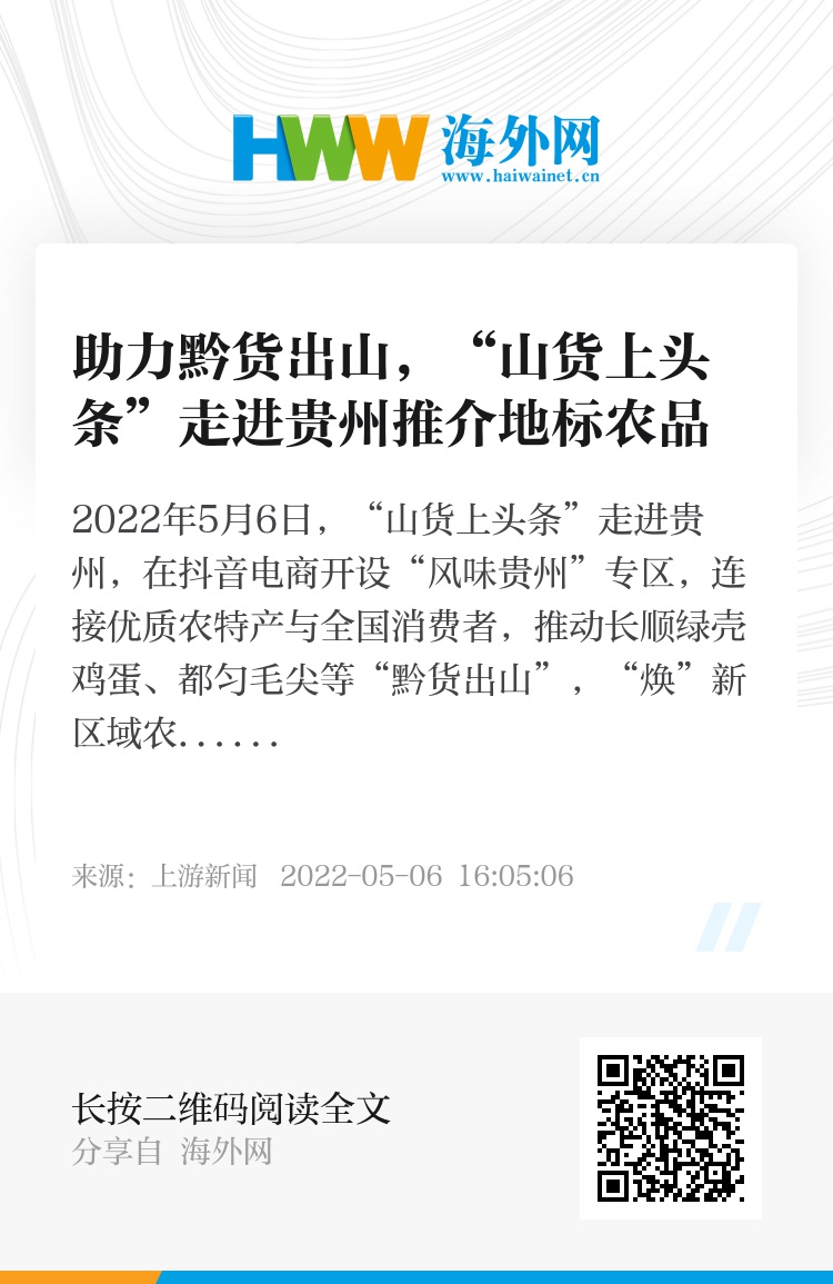 2022年5月6日,“山货上头条”走进贵州,在抖音电商开设“风味贵州”专区,连接优质农特产与全国消费者,推动长顺绿壳鸡蛋、都匀毛尖等“黔货出山”,“焕”新区域农产品品牌。据悉,“风味贵州”线上活动为期7天,至5月12日结束。