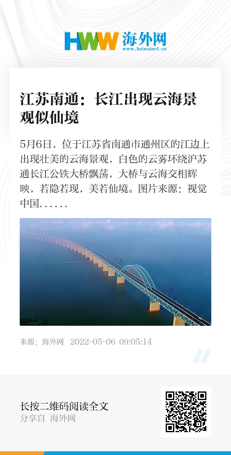 5月6日,位于江苏省南通市通州区的江边上出现壮美的云海景观,白色的云雾环绕沪苏通长江公铁大桥飘荡,大桥与云海交相辉映,若隐若现,美若仙境。图片来源:视觉中国