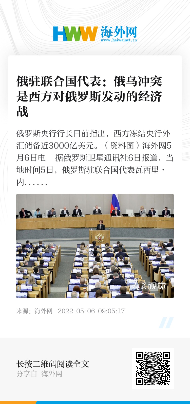海外网5月6日电 据俄罗斯卫星通讯社6日报道,当地时间5日,俄罗斯驻联合国代表瓦西里·内本齐亚在联合国安理会一场关于乌克兰的会议上表示,俄乌冲突不是针对乌克兰的战争,而是西方对俄罗斯发动的经济战。