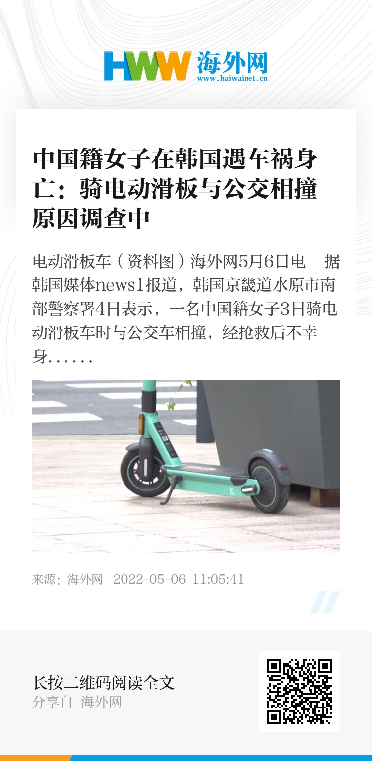 海外网5月6日电 据韩国媒体news1报道,韩国京畿道水原市南部警察署4日表示,一名中国籍女子3日骑电动滑板车时与公交车相撞,经抢救后不幸身亡。