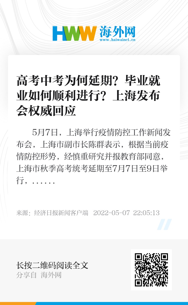5月7日,上海举行疫情防控工作新闻发布会,上海市副市长陈群表示,根据当前疫情防控形势,经慎重研究并报教育部同意,上海市秋季高考统考延期至7月7日至9日举行,高中学业水平等级性考试延期至6月18日至19日举行,中考延期至7月11日至12日举行,取消初中理化实验考试、外语听说测试,相关成绩以满分计入学生中考总成绩。