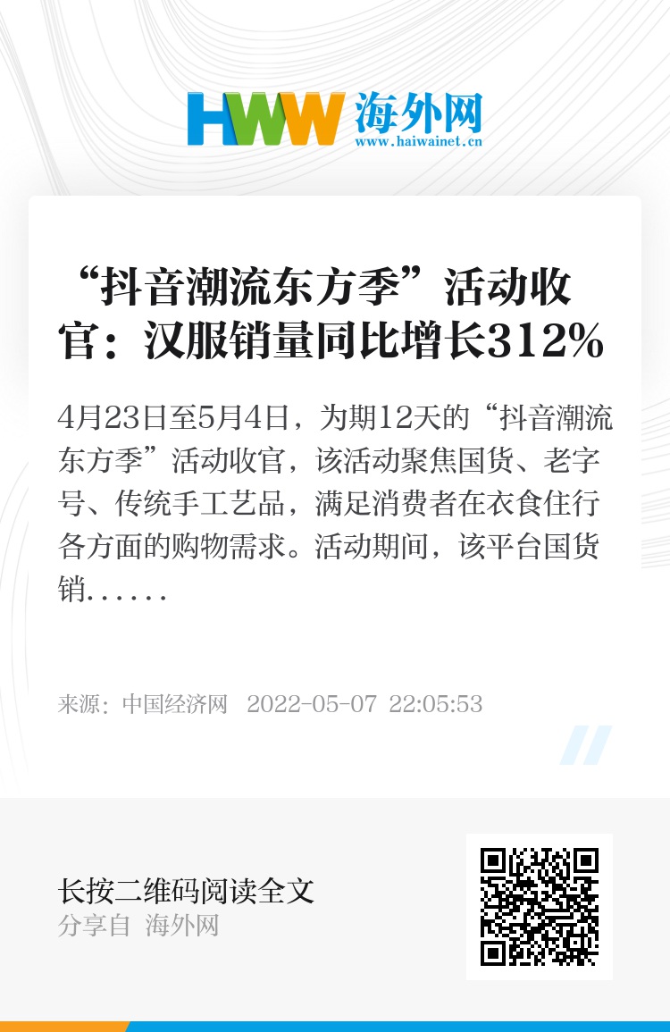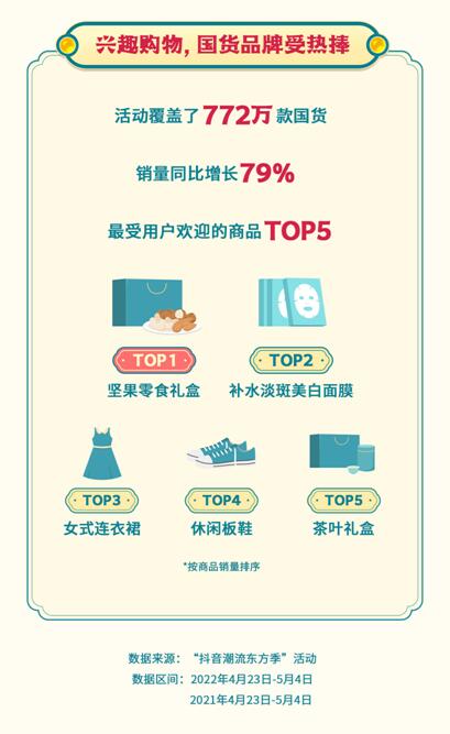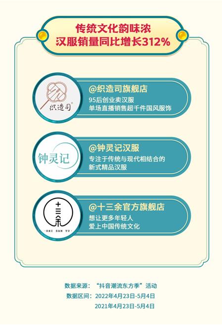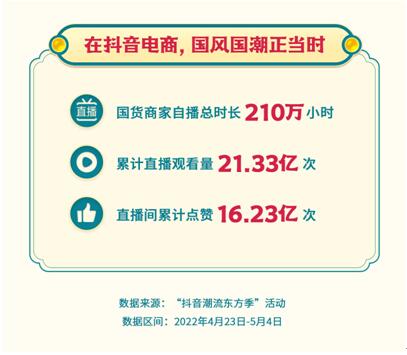 4月23日至5月4日,为期12天的“抖音潮流东方季”活动收官,该活动聚焦国货、老字号、传统手工艺品,满足消费者在衣食住行各方面的购物需求。活动期间,该平台国货销量稳定走高,同比增长79%。其中,汉服深受用户青睐,销量同比增长312%。