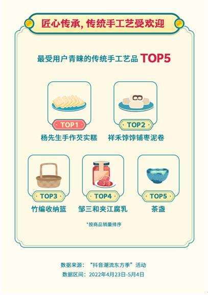 国货发展的过程中,传统手工艺品、非遗好物也借助兴趣电商,被越来越多人看到、购买。数据显示,杨先生手作芡实糕、祥禾饽饽铺枣泥卷、竹编收纳篮、邹三和夹江腐乳、茶盏瓷器等传统手工艺商品,深受消费者喜爱,销量可观。