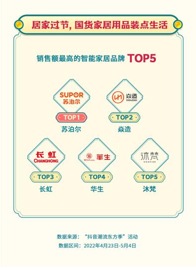 “抖音潮流东方季”活动正值五一假期,大众对智能家居用品消费热情高涨。家用多功能锅、电风扇、家纺用品等成为装点美好生活的潮品。苏泊尔、焱造、长虹、华生和沐梵等智能家居品牌销售火热,整体销售额位居前列。