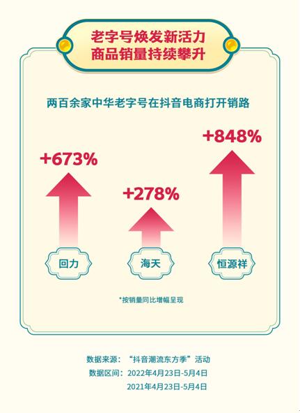 随着国货消费需求不断升级,传统老字号也在传承与创新中变身“新国潮”。据悉,已有两百余家中华老字号通过抖音电商打开了新销路。在“抖音潮流东方季”活动推动下,回力、海天、恒源祥销量成倍数增长,同比增幅达673%、278%和848%。