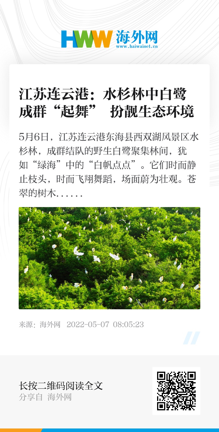 5月6日,江苏连云港东海县西双湖风景区水杉林,成群结队的野生白鹭聚集林间,犹如“绿海”中的“白帆点点”。它们时而静止枝头,时而飞翔舞蹈,场面蔚为壮观。苍翠的树木、清澈的湖水与林间白鹭构成了一幅美丽生态画卷。近年来,东海县加大生态保护力度,坚持绿色发展、生态发展,景区生物呈现多样性,吸引了大量留鸟和候鸟,为景区生态游增加了亮点。图片来源:视觉中国