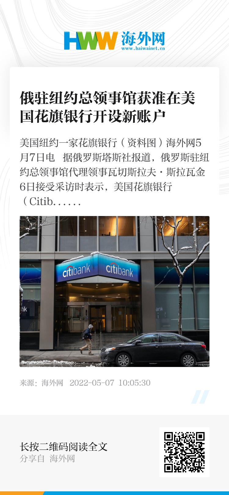海外网5月7日电 据俄罗斯塔斯社报道,俄罗斯驻纽约总领事馆代理领事瓦切斯拉夫·斯拉瓦金6日接受采访时表示,美国花旗银行(Citibank)同意为俄罗斯驻纽约总领事馆开设账户。