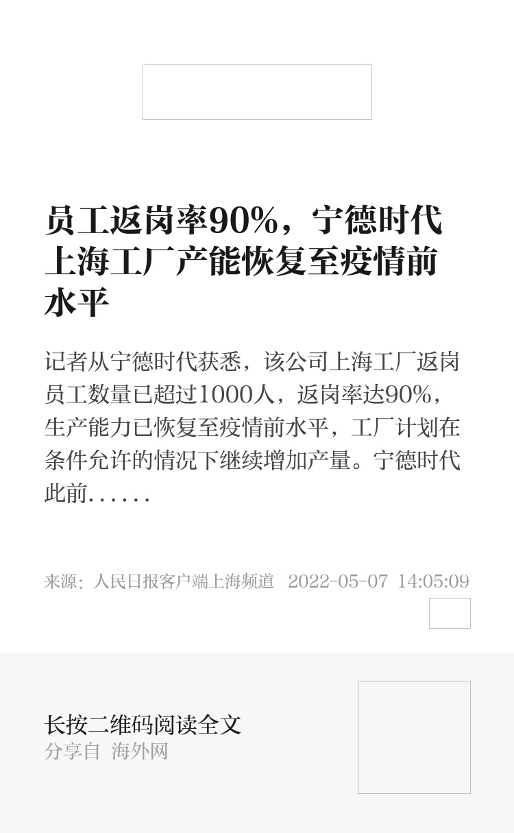 宁德时代此前宣布,位于上海临港的生产动力电池模组的工厂已于4月18日恢复生产。该工厂毗邻特斯拉上海超级工厂。特斯拉是去年宁德时代动力电池产品的最大客户。