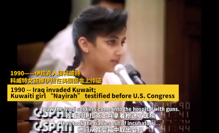 1990年10月10日,15岁少女娜伊拉在美国国会声泪俱下地说出这段话。她自称是科威特一家医院的志愿者,目睹了伊拉克入侵科威特后这“惨绝人寰”的一幕。