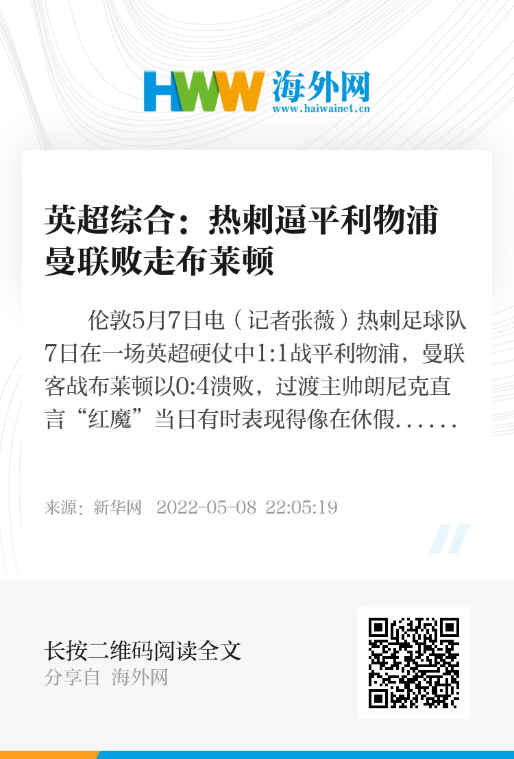 新华社伦敦5月7日电(记者张薇)热刺足球队7日在一场英超硬仗中1:1战平利物浦,曼联客战布莱顿以0:4溃败,过渡主帅朗尼克直言“红魔”当日有时表现得像在休假。