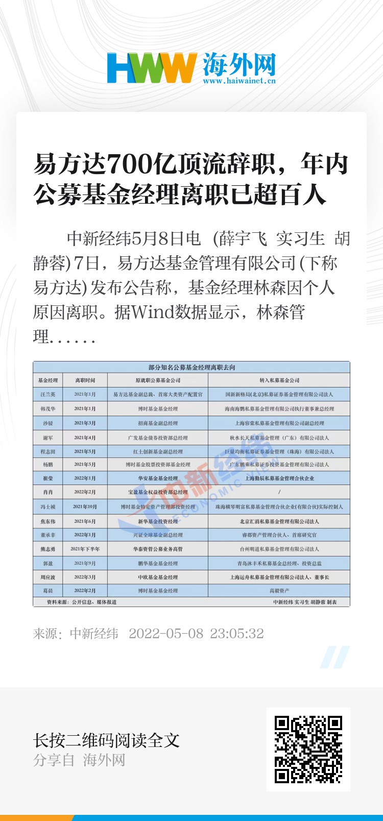 中新经纬5月8日电 (薛宇飞 实习生 胡静蓉)7日,易方达基金管理有限公司(下称易方达)发布公告称,基金经理林森因个人原因离职。据Wind数据显示,林森管理的公募基金规模在2021年四季度末超过千亿元人民币,截至2022年一季度末,也有近700亿元,称得上行业顶流。林森将去何处任职暂不得而知,但外界多将此与当前的“公奔私”现象相关联。