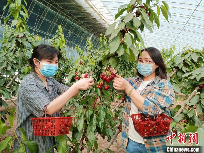 游客们正在温宿县柯柯牙镇帕克勒克村大棚内采摘车厘子。 冯磊 摄