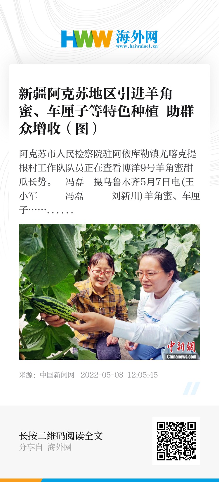 中新网乌鲁木齐5月7日电(王小军 冯磊 刘新川)羊角蜜、车厘子……走进新疆阿克苏地区各村,从大棚到农田,一个个特色种植业蓬勃发展,阿克苏地区各“访惠聚”驻村工作队与村“两委”,坚持因村制宜、因地施策,走出一条符合自身实际的乡村振兴新路子。
