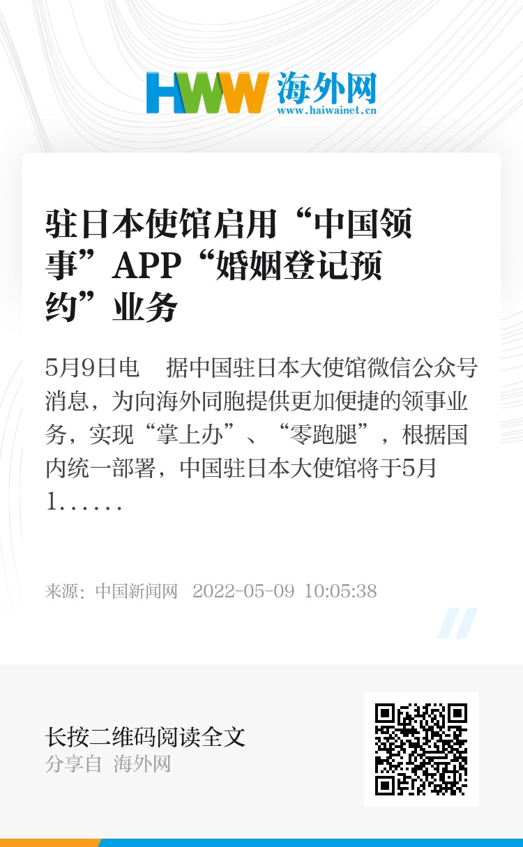 中新网5月9日电 据中国驻日本大使馆微信公众号消息,为向海外同胞提供更加便捷的领事业务,实现“掌上办”、“零跑腿”,根据国内统一部署,中国驻日本大使馆将于5月16日正式启用中国领事APP婚姻登记预约业务。(原婚姻登记预约网站预约将不再受理新的预约申请,已完成预约的仍然有效。)