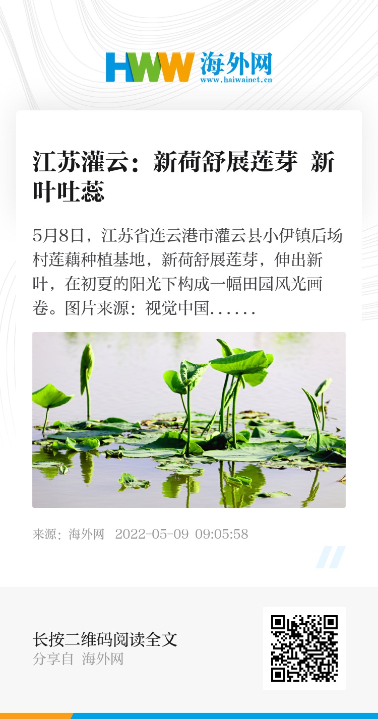 32412910,.江苏灌云:新荷舒展莲芽 新叶吐蕊,.2022-05-09 09:42:58,.204428,.张青津、刘素素