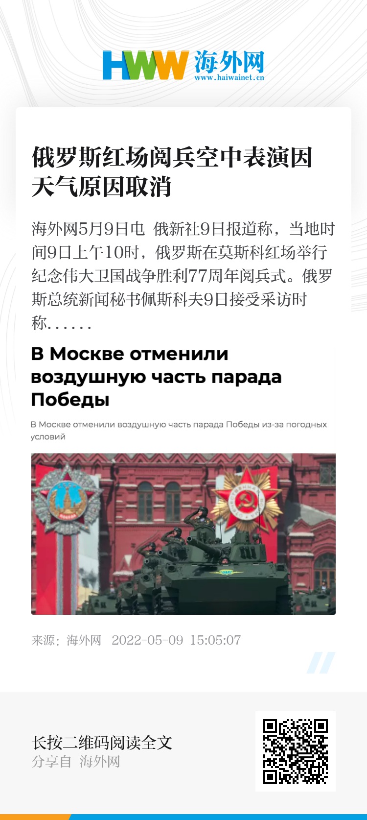 海外网5月9日电 俄新社9日报道称,当地时间9日上午10时,俄罗斯在莫斯科红场举行纪念伟大卫国战争胜利77周年阅兵式。俄罗斯总统新闻秘书佩斯科夫9日接受采访时称,由于天气原因,红场阅兵的空中表演被取消。(海外网 张琪)